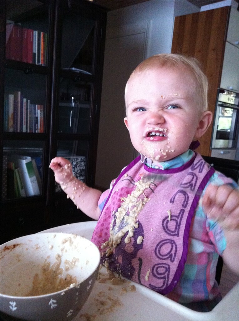 ahr, men altså... Lod hende spise mens jeg ordnede opvasker - som så mange gange før... Hun valgte så bare at tippe lige lovligt meget med tallerkenen for at få bedre fat i havregrøden (med hånden, ikke med skeen) ... Men de er jo skønne selvom de er nogle små svin ind i mellem