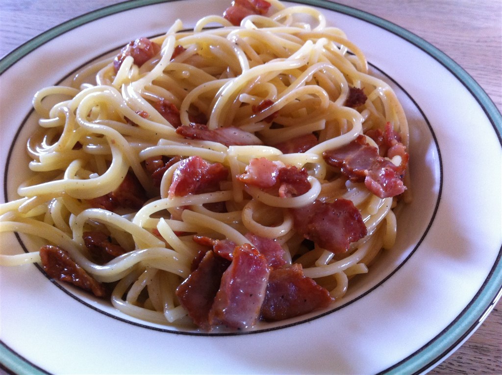 Men kommer nogle gange lidt ekstra grønt i retten, fx. lidt løg og forårsløg eller lignende, som passer til, så det ikke bare er bacon/pasta/fløde/ost/æg.