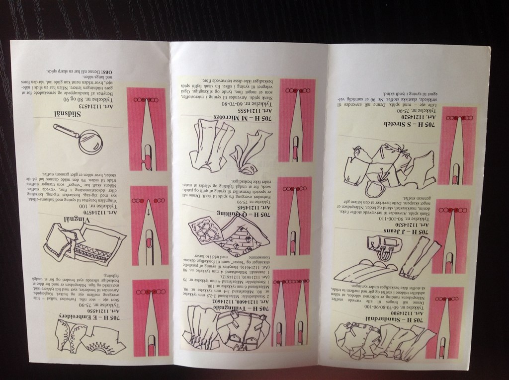 Nåle bruger jeg stort set kun alm 80 til alt hvad jeg syer. Syer ikke meget jersy. Men igen der ville jeg vælge en kvalitets nål og bruger kun schmetz nåle.