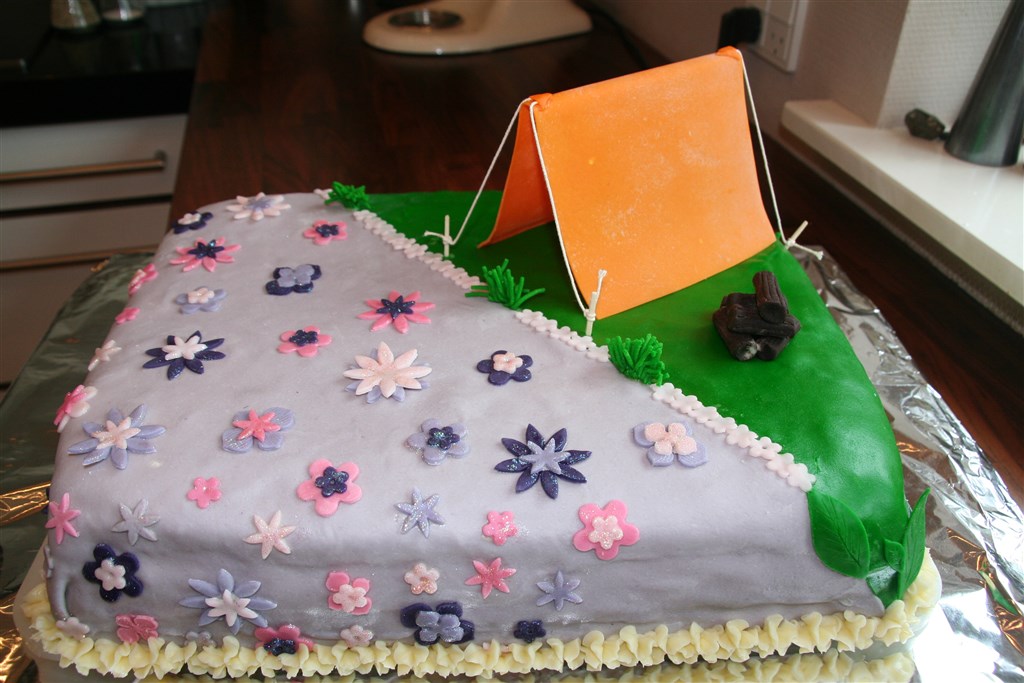 Konfirmationskage til spejderpigen, der havde ønsket en ren blomsterkage, men moren synes der skulle være lidt tema