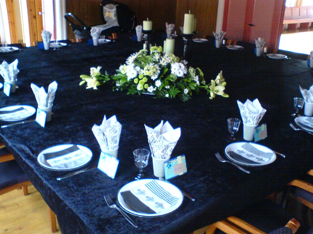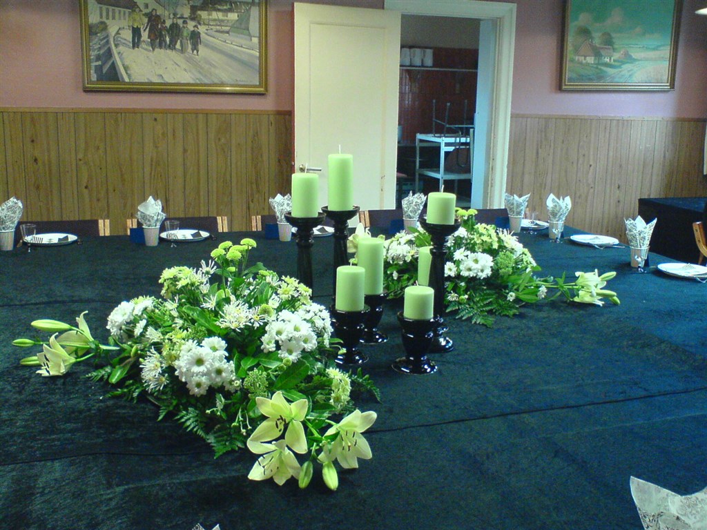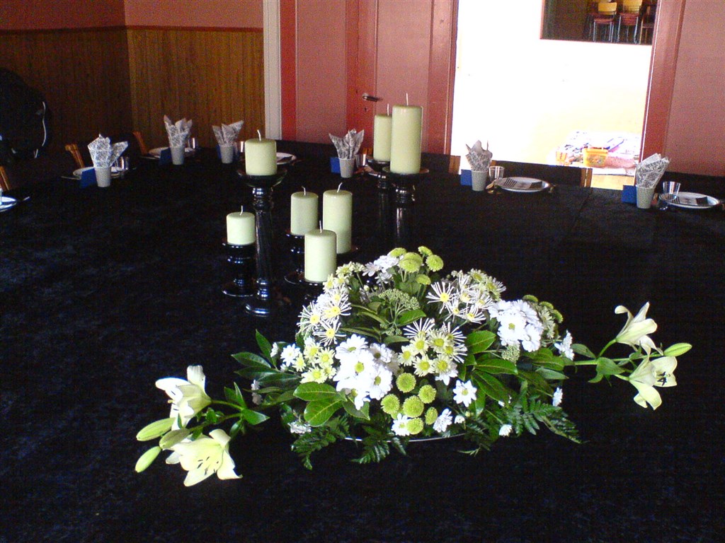 Blomsterdekorationerne har jeg selv lavet. Det kostede ca 350 kr i blomster, tør ikke gætte på prisen, hvis de skulle købes. Den ene lagde vi over på min mands bedsteforældres gravsted efter dagen var slut, de døde med 14 dages mellemrum ca en måned før Sophus blev født.