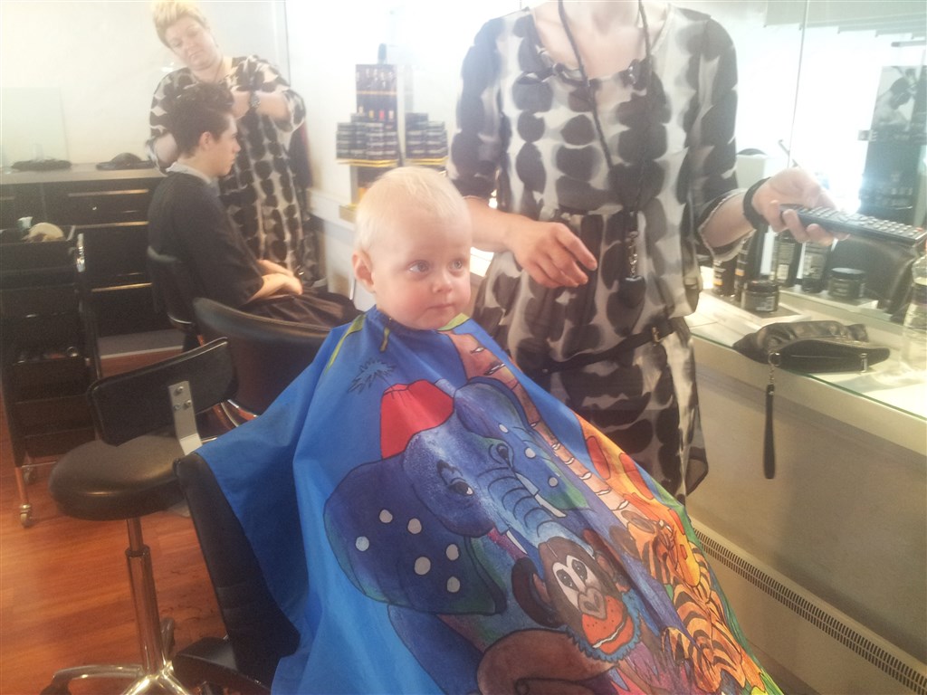 Havde frygtet det lidt men hun blev sat i stolen.. kappe på og tegnefilm tændt og så blev hun klippet..