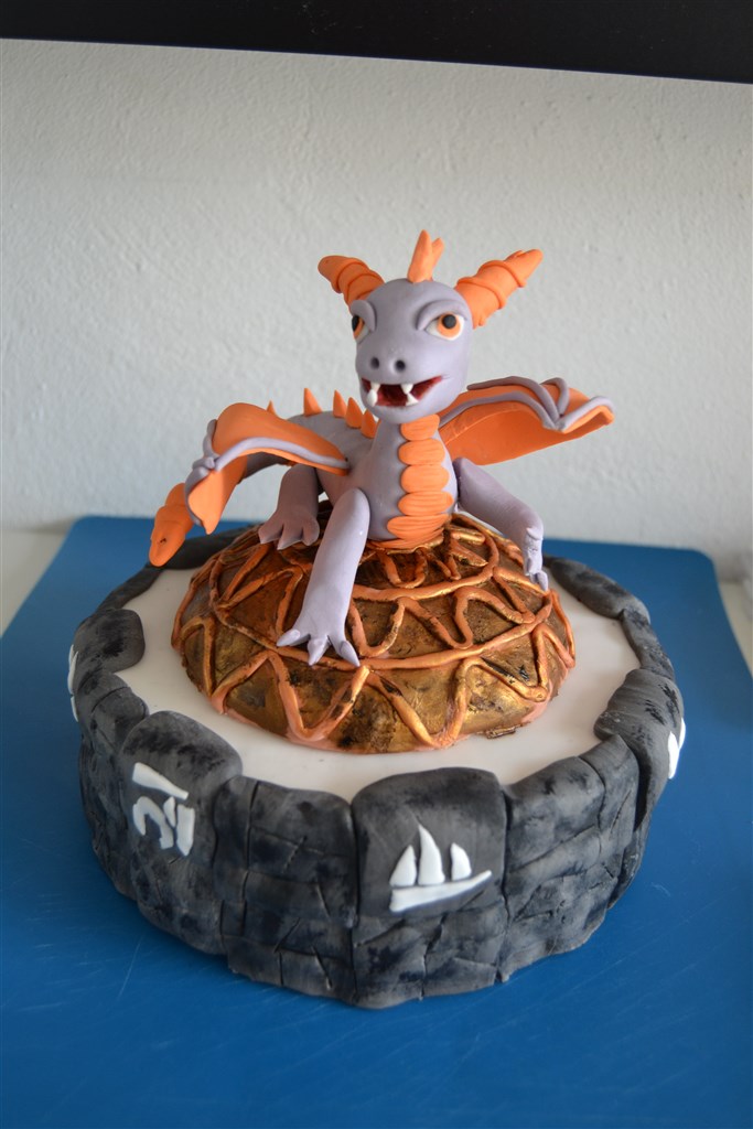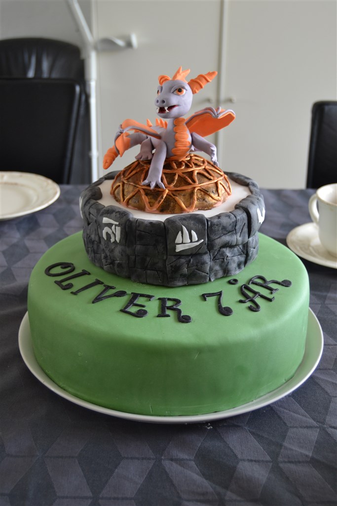 Min seneste kage til min søns 7 års fødselsdag. Han havde for længe siden bestilt en Skylanders kage med Spyro. Jeg havde lykkeligt glemt alt om det, indtil i onsdag hvor han mindede mig om det. Så fik mor ellers travlt, da kagen skulle bruges lørdag. Og hold op hvor det drillede. Halen knækkede af mindst 10 gange og nægtede at sidde fast. Vingerne drillede også, så jeg var meget glad da kagen endelig kom på bordet og Spyro havde både hale og vinger.