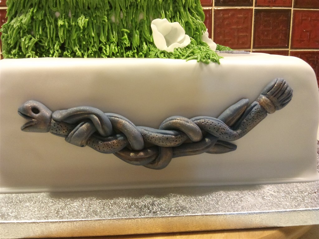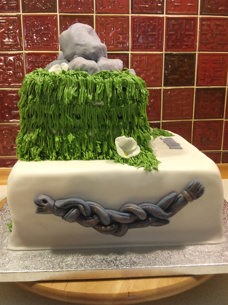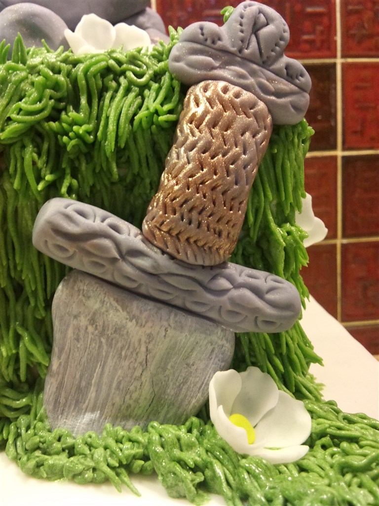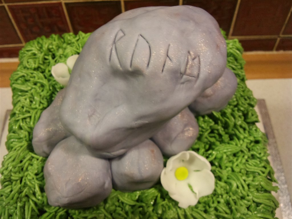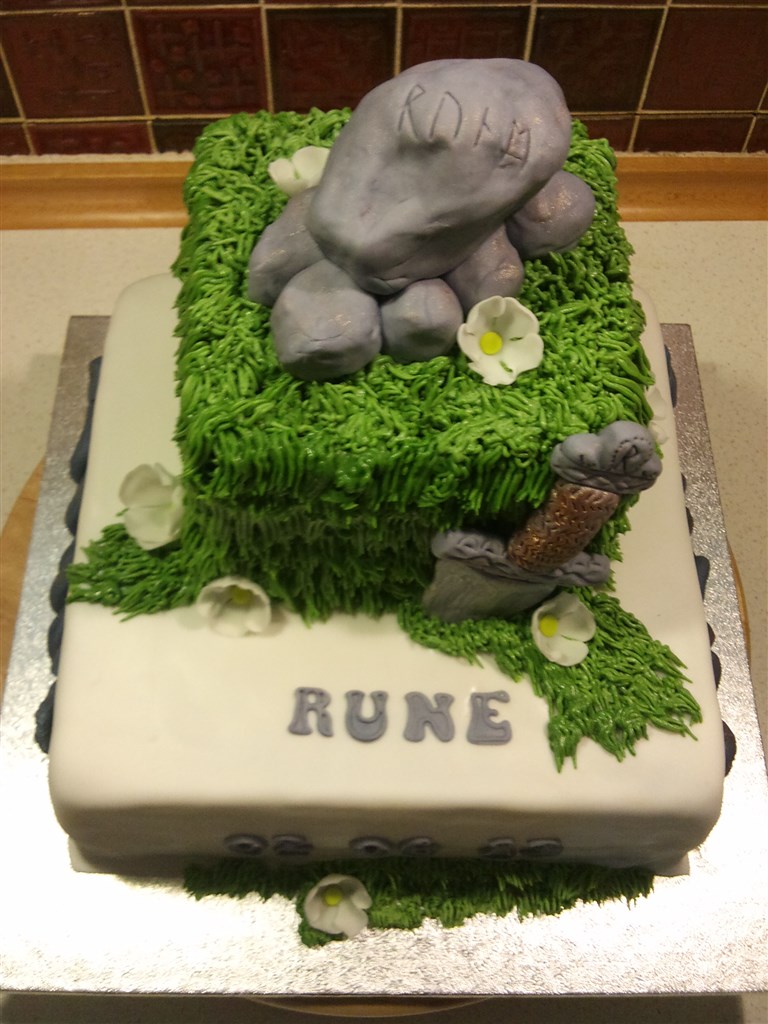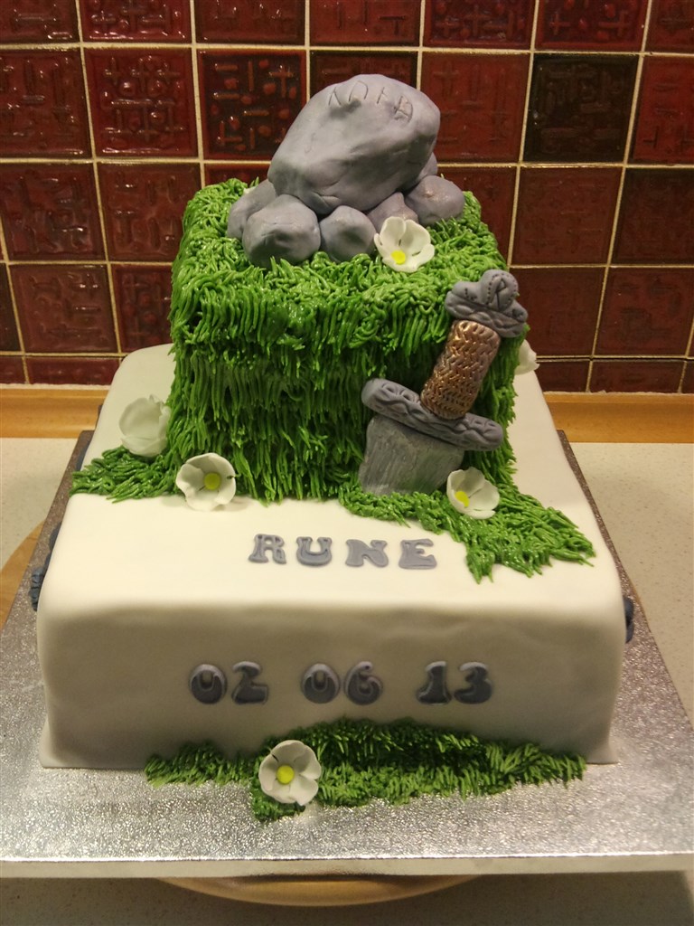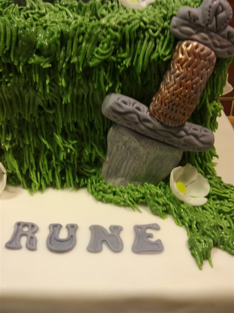 Der skulle være en bautasten med Rune i runer, noget vikinge-mønster og nogle hvide blomster, og jeg lavede et sværd derpå også.