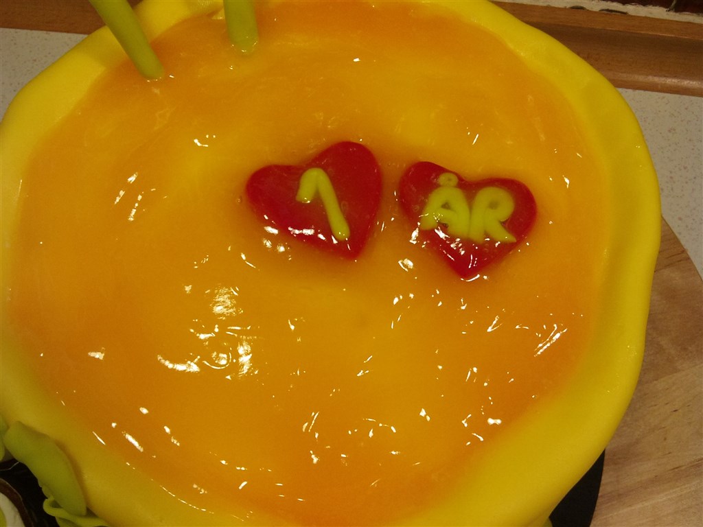 Jo, jeg forsøgte at lave noget, der lignede et gult bæger, så kom jeg noget "saft" i med "hjerteisterninger" med 1 år på, to sugerør fordi de er to, og så en flok muffins ved siden af til det store glas saft
