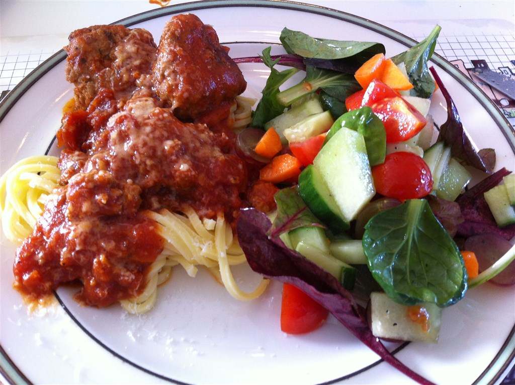Spaghetti med kødboller ala lady & vagabonden med salat
