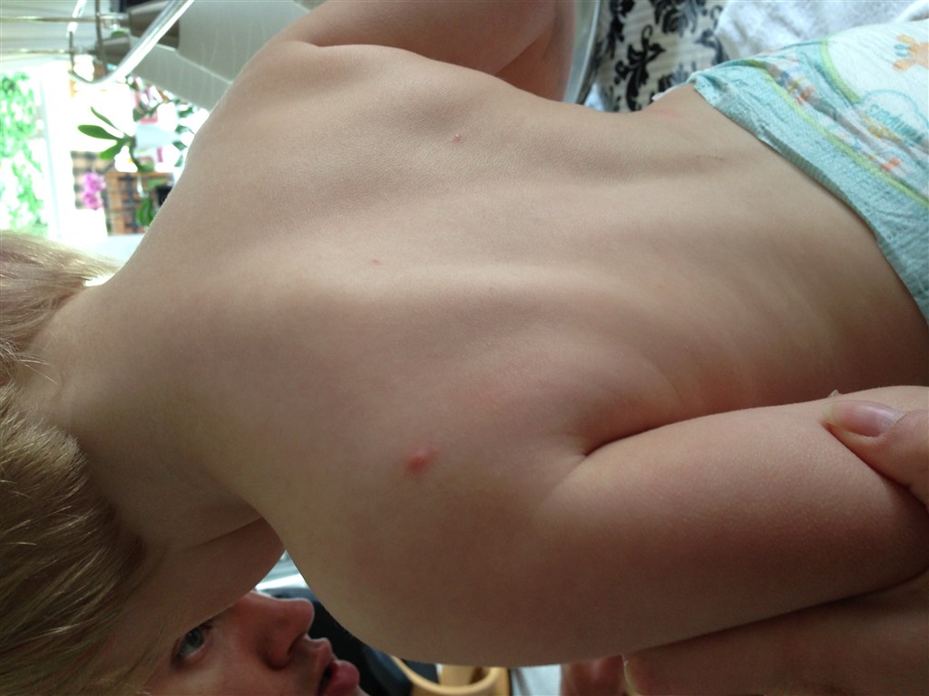 Hej derude Er det her skoldkopper? Eller hvad er det? Hun har 3 på ryggen, har ikke feber eller på nogen anden måde generet..Hjælp!