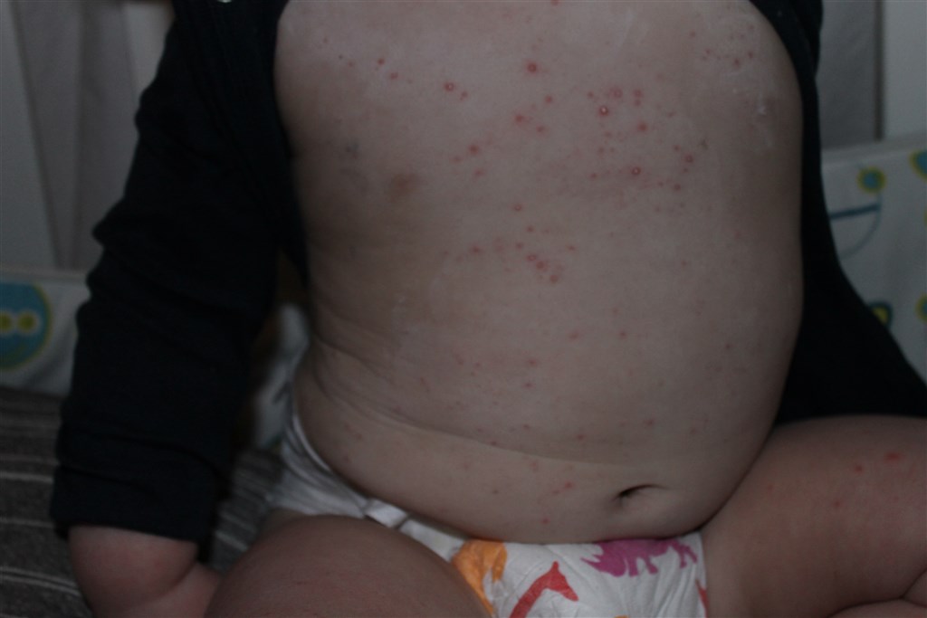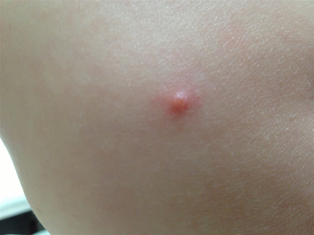 Nadia Maya skriver: Den første opdagede jeg igår morges som en lille rød knop som forandrede sig til hun kom hjem fra dagpleje. Så har har hun fået 2 mere..