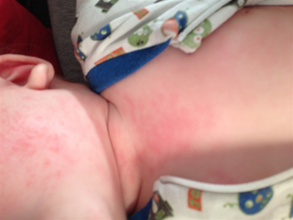 Min lille datter på 3 mdr. har den sidste uge haft noget rødligt udslæt med en lille "knop" i midten. Jeg mistænker Arla Babymælk for det, da jeg synes det er startet efter vi begyndte at give en smule om dagen som supplement til amningen. Det ligner måske varmeknopper, men hun er ikke varm og hun slår ud selvom hun kun har ble eller meget lidt tøj på. Det er ikke noget voldsomt udslæt måske omkring 5-6 plamager fordelt på kroppen. De kan komme på ben, mave, hals, hænder, ansigt. De forsvinder okay hurtigt i hvert fald efter et døgn, men har været der dagligt i godt en uge nu. Har desværre ikke noget billede.