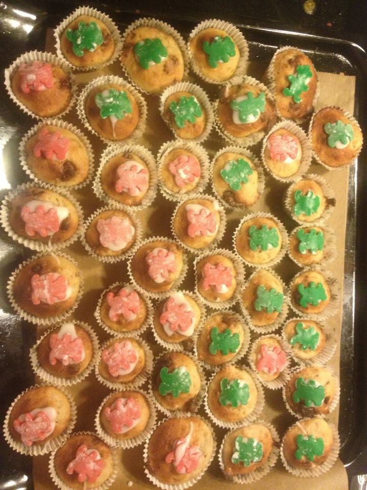 Er de ikke fine?? Det er banan/chokolade muffins med små bamser i fondant ..