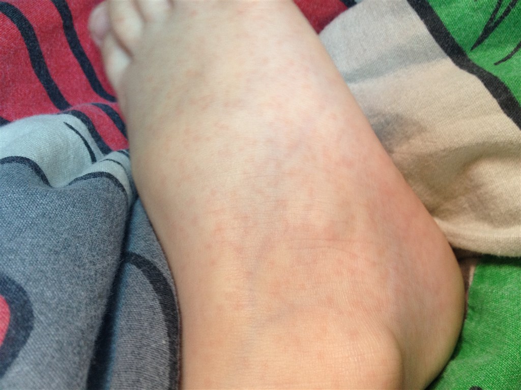 jeg henter ham selvfølgelig. Han får lidt panodil til at nedsætte feberen.. Han bliver pludselig ude af kontrol, kan ikke få ordentlig kontakt til ham og jeg opdager små røde prikker under hans hud. De spreder sig meget hurtigt. Ringer med det samme til lægen og vi får dommen.