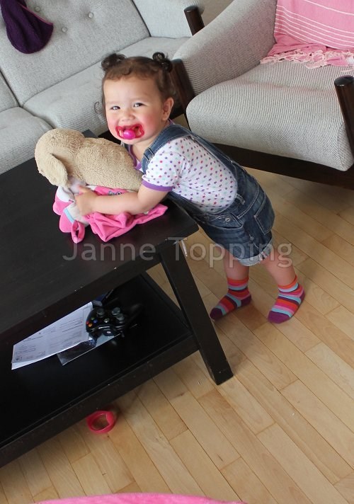 Jeg havde jo målt hende til 92 cm og synes det var vildt, at hun var så lang, og var vokset 17 cm på 8 måneder. Målte hende liggende. Forleden stilte jeg hende op af den wallsticker-højdemåler vi har, som sagde 84 cm. Så tænkte jeg: "Hold kæft vi har været dårlige til at hænge den op!", så jeg målte efter, og den var kun 1 cm forkert. Så Rose er altså 85 cm lang, ikke 92! Haha! Men stadig knap 12 kilo