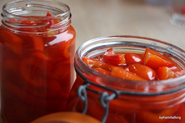Peberfrugterne flækkes og kerner og stilk fjernes. Vand og salt røres sammen til salten er opløst, peberfrugterne skæres i strimler og kommes i og stilles til side i ca. 3 timer. Derefter hældes saltlagen fra. Eddike og sukker bringes i kog i 2 minutter, peberfrugterne tilsættes og varmes op til kogepunktet, hvorefter de koger et par minutter. Vi foretrækker lidt bid i, så prøv dig frem. Til slut tilsættes atamon og hældes på glas og sættes i køleskabet.
