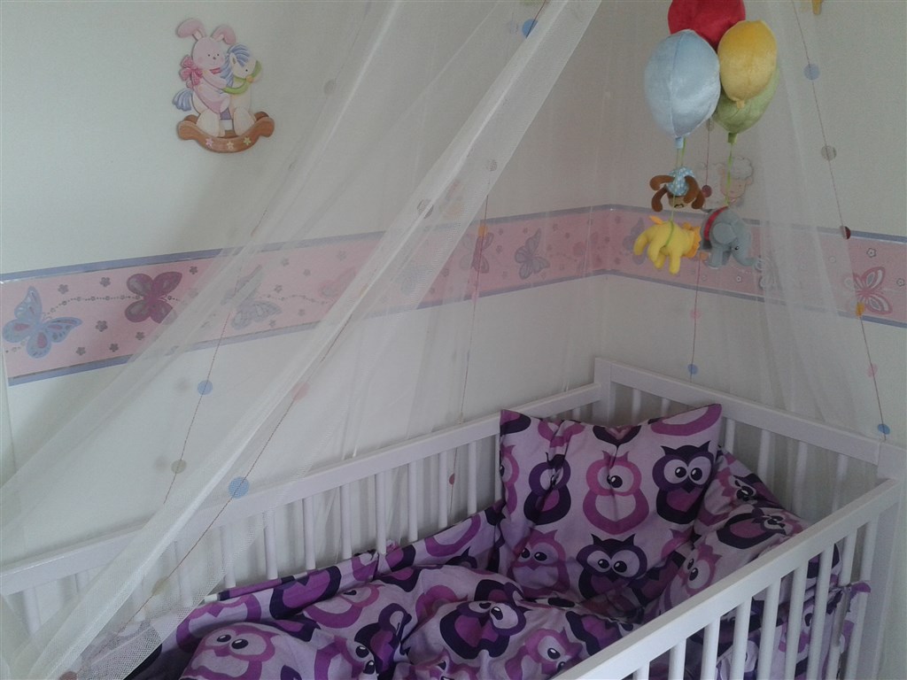 Da han var baby var der en stofble der hvor han lagde med hovedet, sat i spænd hvis han nu skulle gylpe (vi bruger ikke baby puder), en dyne og sengerand. Lillesøster får det på samme måde, de skal sove i sengen og ikke lege, så legetøj høre hos os ikke til i en seng og jeg forbinder en uro med legetøj.