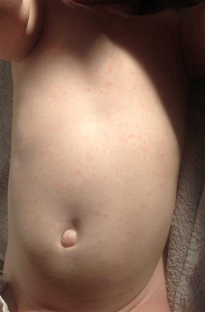 Går ud fra det var 3 dages feber .. Her til morgen har vi så opdaget dette udslæt .. Først startede det på maven , nu ryggen , men ikke armene eller benene ..