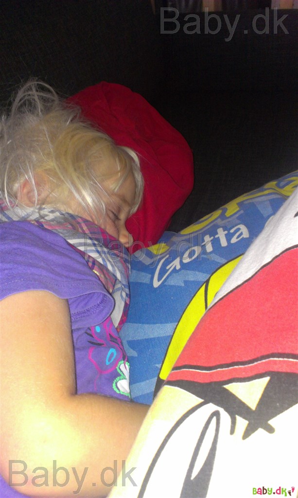 Hun har en grim hoste og ondt i halsen... Jeg tror hun har feber, men er ikke sikker... Hun er pylret og morsyg og vil allerhelst være lige ved siden af eller ovenpå mig ...