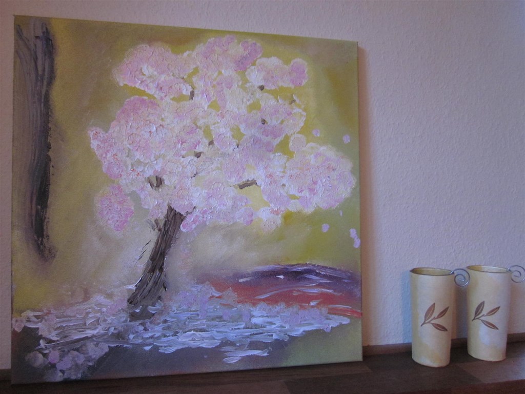 Muhmi skriver: Ja det er lidt mørkt, men jeg har haft en rigtig skod-dag og mine triste tanker kom ud i et billede med et japansk kirsebærtræ... Træets blomstring symboliserer livet af vores nu afdøde hankat Klods-Hans, kort men smukt! I må meget gerne sige om I synes om det.. Jeg skal have malet et i nogle gladere farver på et andet tidspunkt, men synes det er smukt og det betyder noget for mig Sov sødt lille Klods-Hans... Du er elsket og savnet