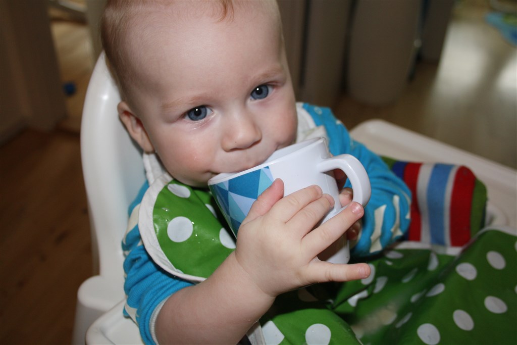 han GRINER og smiler helt vildt og angriber koppen når han skal have vand og vil helst selv have lov