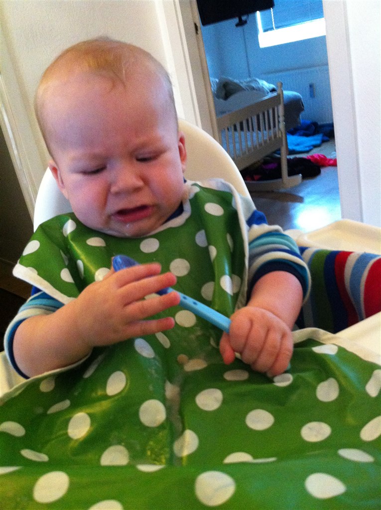 Vi er startet på grød her den anden dag; Isaak er IKKE just imponeret over sin mors kogekundskaber.. men jeg håber på han bare lige skal vænne sig til det