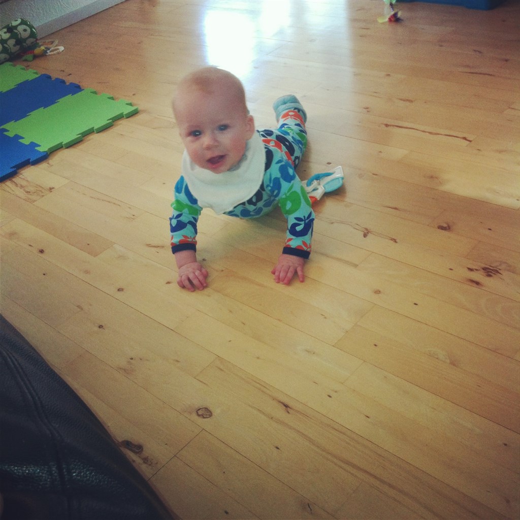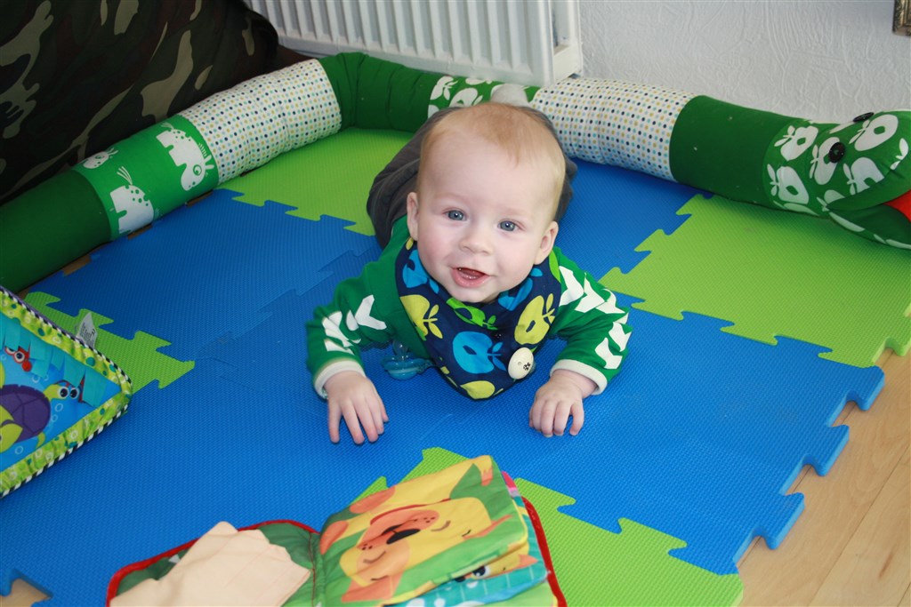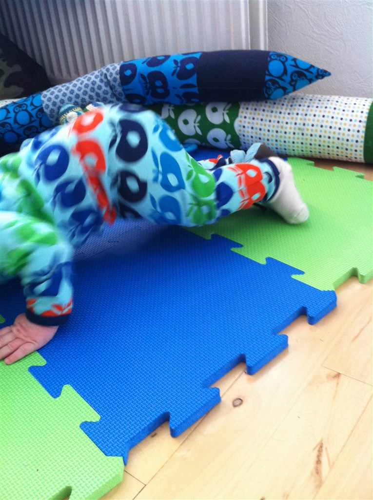 Han har længe møvet sig rundt, men bevægelserne bliver mere og mere kontrollerede og det er UMULIGT(!!) at få ham til at blive på sit skumgulv! han er i heeele stuen