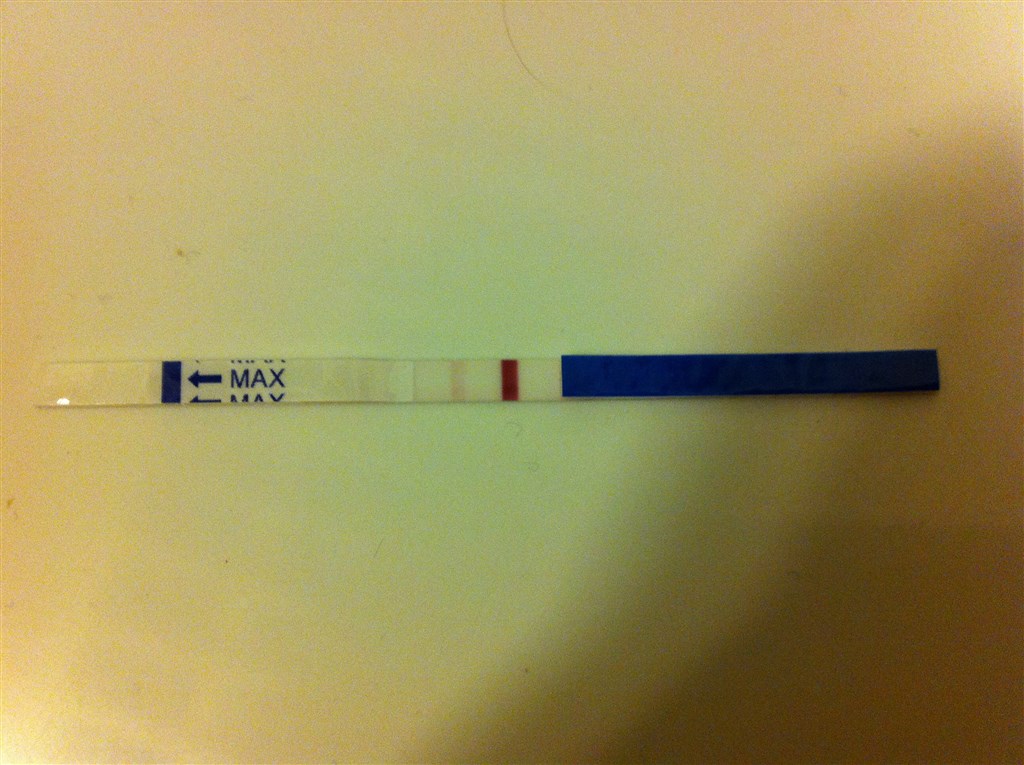 Her er min graviditetstest fra i dag, hvor jeg har testdag. Den ekstra streg kom inden for et minut. Den er ganske vist ikke så tydelig, men jeg kunne da se den med mine søvndrukne øjne. Kan I se den?