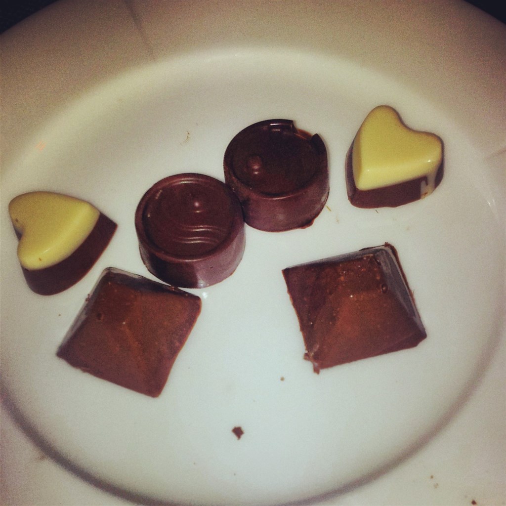 Thi hi :-D Hjerte er med alm og hvid chokolade Trekantet er med alm chokolade med nogaut og kiks Den runde er med alm chokolade og marcipan