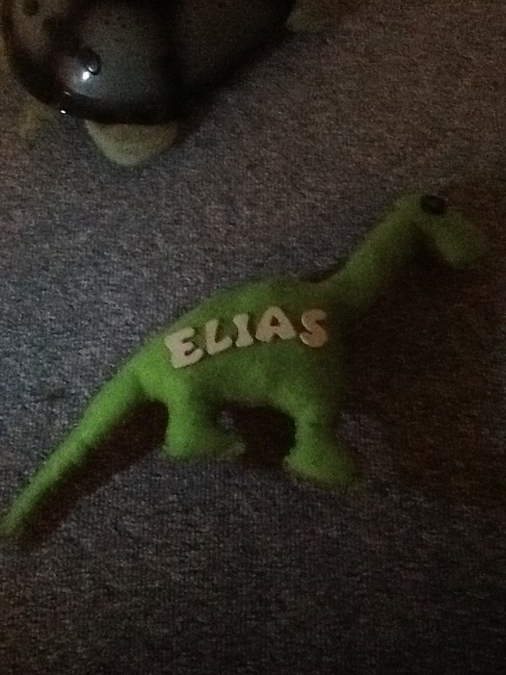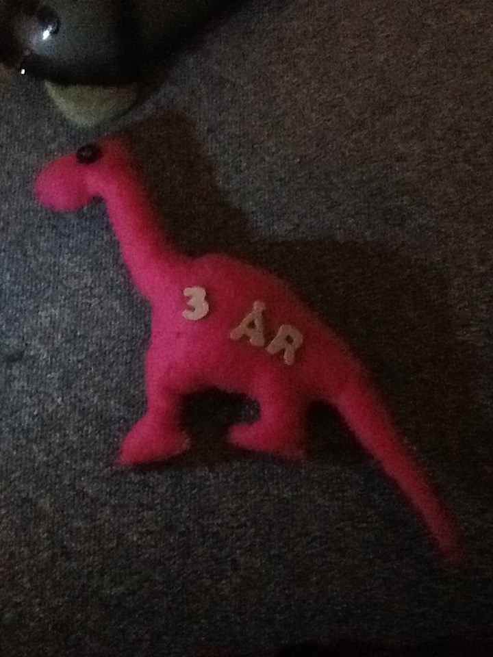 Jeg har lige syet en hvid (forside)og sort (bagside) ugle meD store blå øjne samt en Dino i lyserød (bagside)og grøn forside hvor der med træbogstaver og tal står Elias på den ene side og 3 år på den anden side.