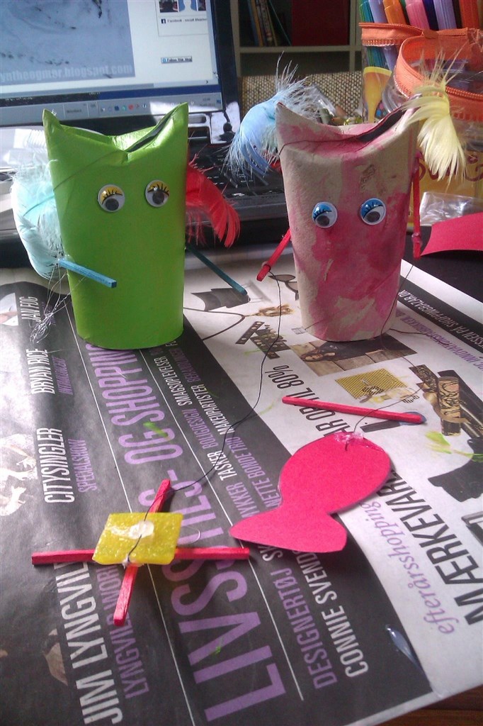 Og to toiletrullefigurer hvoraf den ene er Elias' som fisker og har fanget en krabbe og en stor fisk