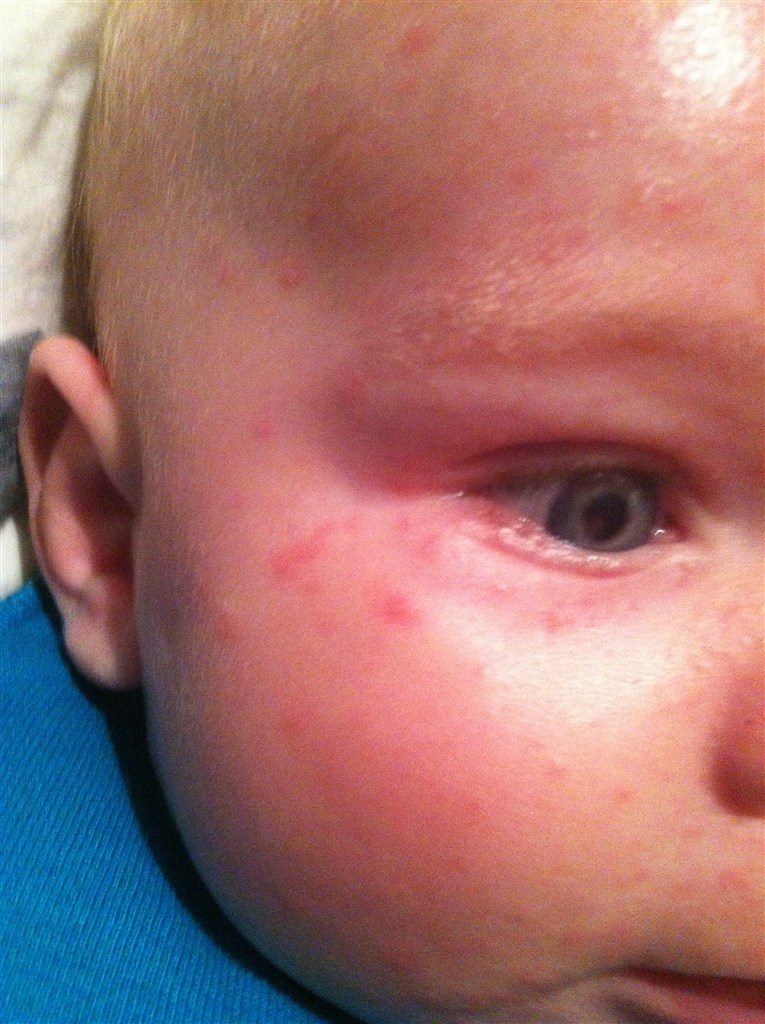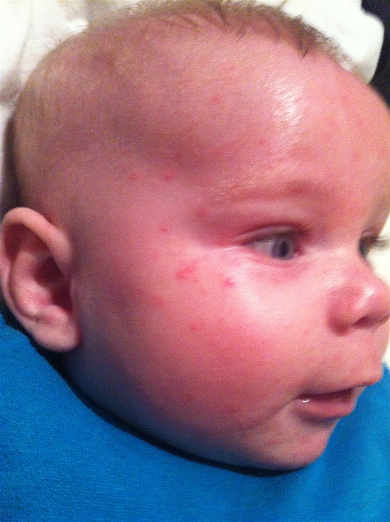 Min søn på 5 måneder ligner lige pludselig en teenager!! Han har fået nogle mærkelige knopper der nogle steder ligner bumser. Han startede på grød (majs, ris, hirse og æble) for 1 måned siden og udslettet har kun været der et par uger, så tænker ikke umiddelbart det kan være det