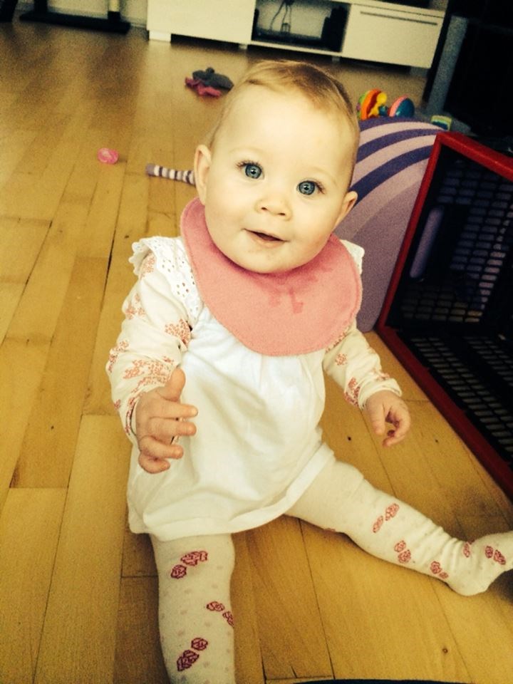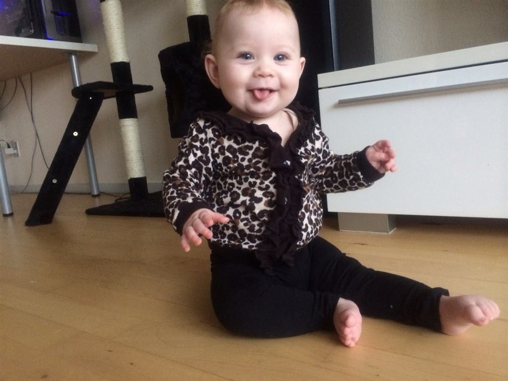 Hun kravler, hun kan sidde op selv, er begyndt at rejse sig og stå ret stabilt, super glad pige, har fået 2 små bisser ( på tide )