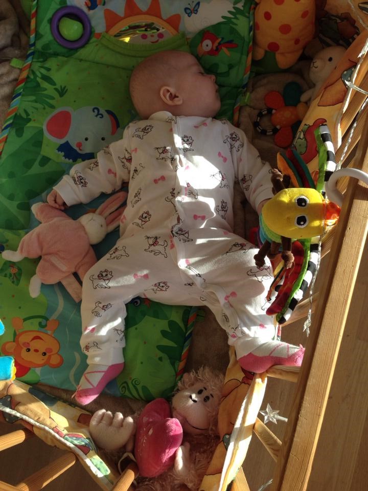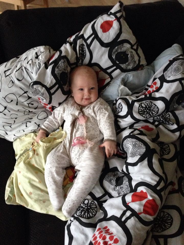 Min Sophia er lige knap 4½ mdr nu, vejer 6,7 kg og måler 62 cm.