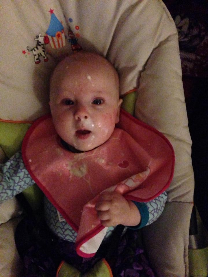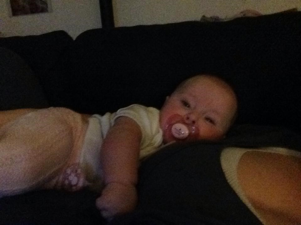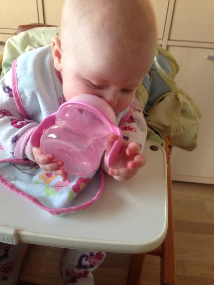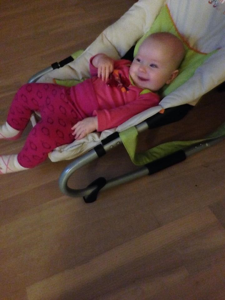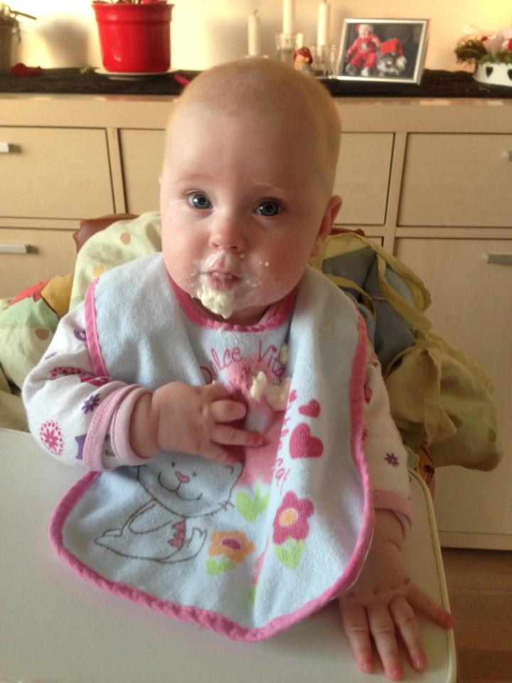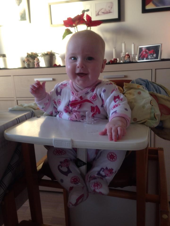 Alt skal i munden, tæerne skal hives, elsker at stå op, ruller fra mave til ryg.. Ja, hun er bare rigtig god og synes bare min lille baby bliver alt for hurtigt stor. Jeg ammede fuldt til hun var lige knap 4 mdr og nu er det delvist amning og flaske, eftersom hun ikke gider mig så meget mere end som hvis hun er træt og vil hygge. Vi er startet på grød/mos og det hitter også herhjemme.