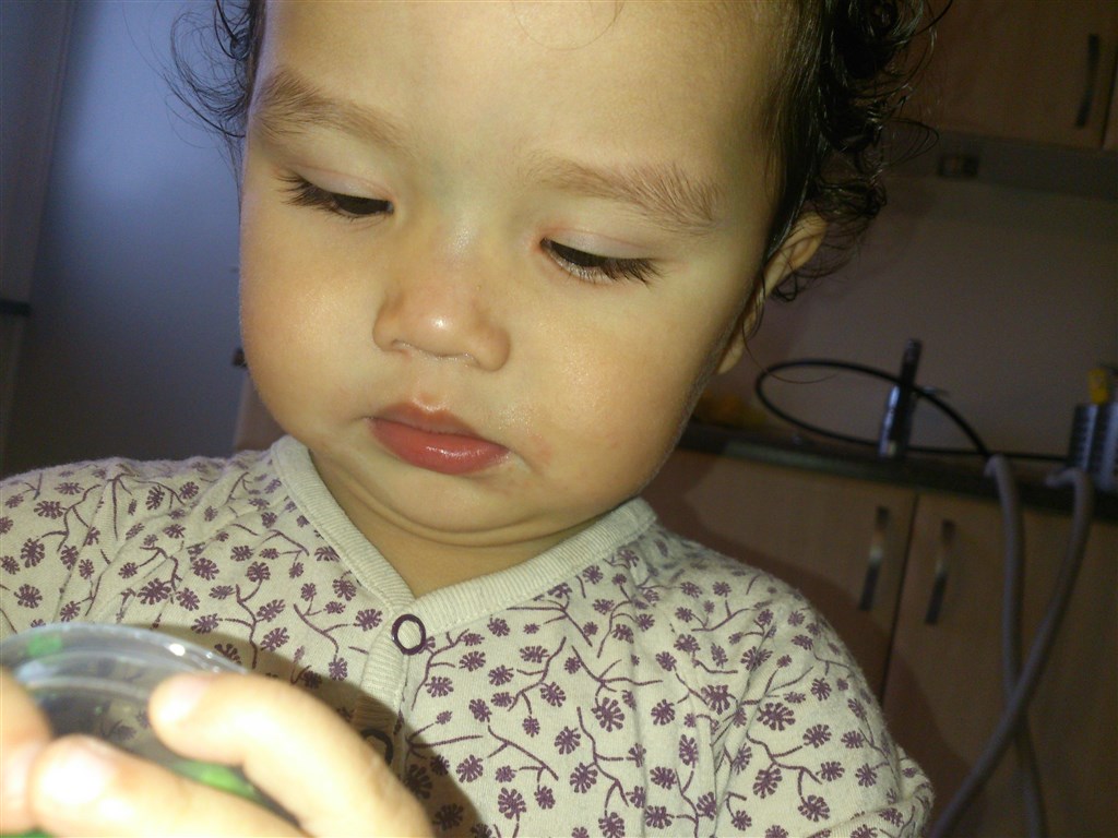 Jeg håber i kan se det ud fra billederne. Rose har fået lidt udslæt ved højre side af munden (hendes venstre). Hun har været syg længe med snot og savl så det er nok derfor.