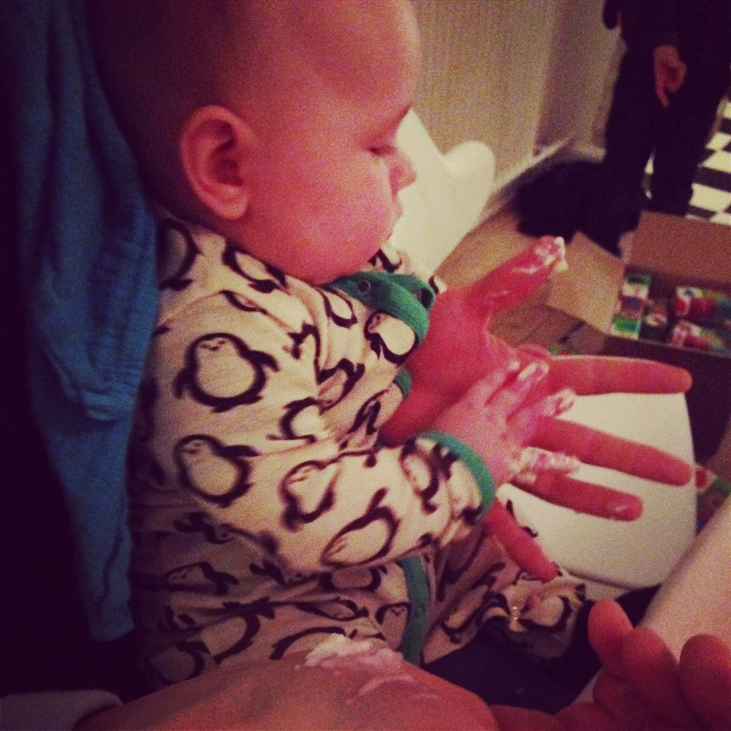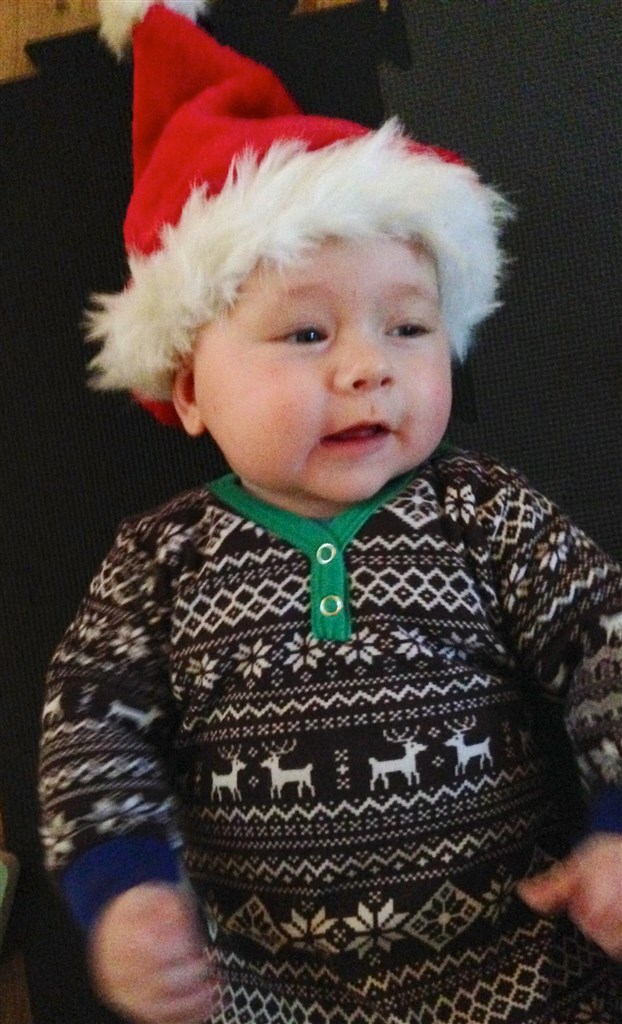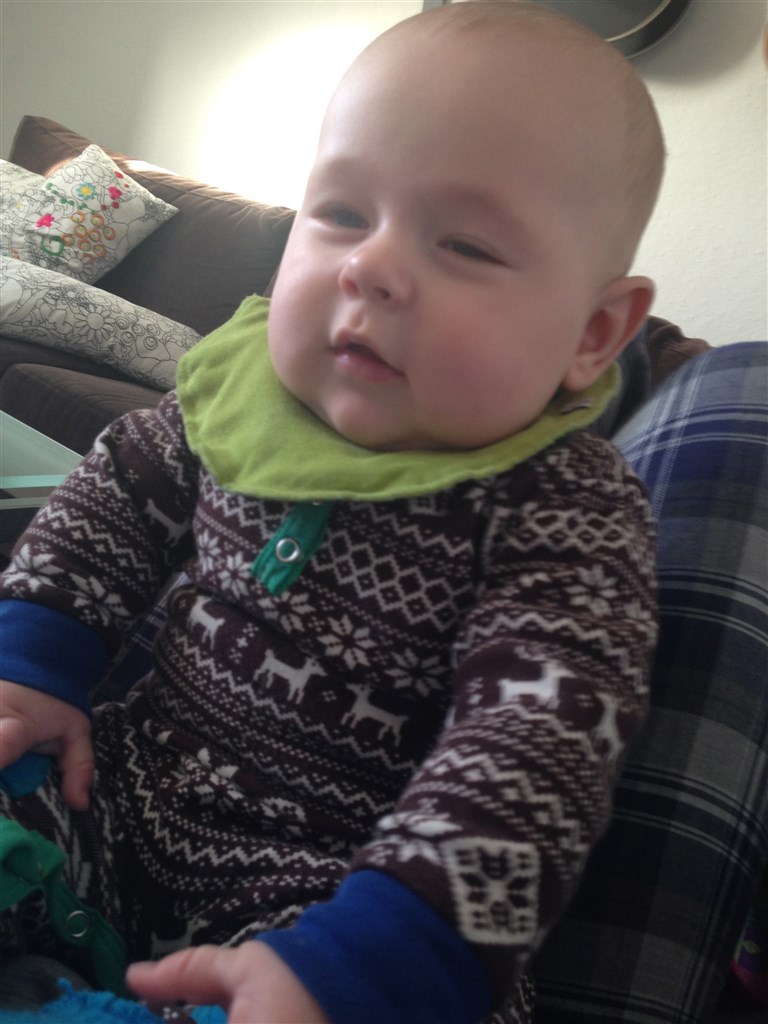 Den 19. december var han til 5 mdrs undersøgelse og blev målt til 70 cm og 8860 g og lægen roste ham til skyerne. Jeg fuldammer fortsat, selvom han er ved at være godt og grundig klar til mere (se billede længere nede, hvor han juleaften pludselig havde begge hænder i ris alá manden..far var uopmærksom i 2 sek