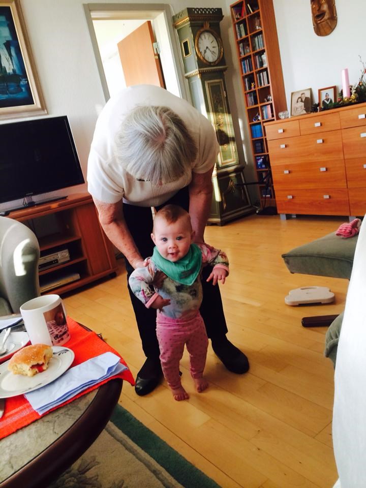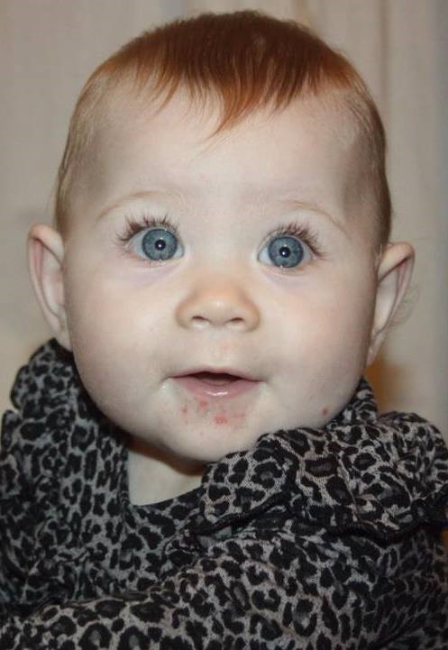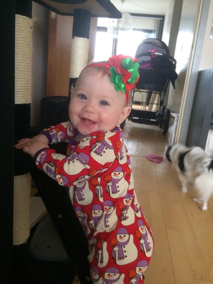Hun kan tage små skridt, faktisk ret hurtigt, med sin gåvogn, hun kravler rigtigt nu, rejser sig op selv og sætter sig op selv. Hun har fået 2 små bisser, langt kastanjefarvet hår med rødligt skær fra sin far... Hun er blevet så morsyg på det sidste, men hold nu op, hvor er det bare dejligt at få møs og krammer hele dagen af sin lille mus