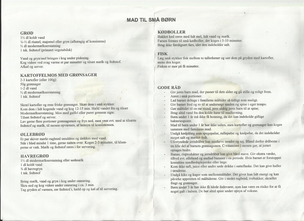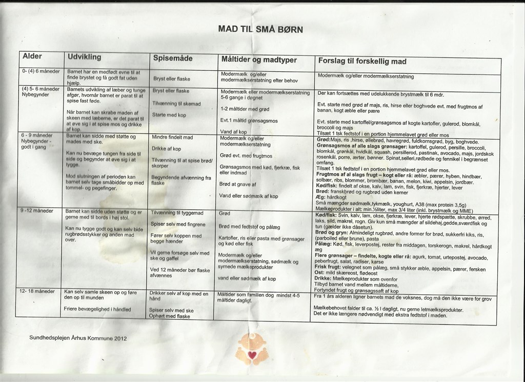 Så har jeg prøvet at skanne det papir vi fik til madvejledningen ind. Det har været udsat for lidt kaffe deraf misfavningerne men det burde stadig være til at læse