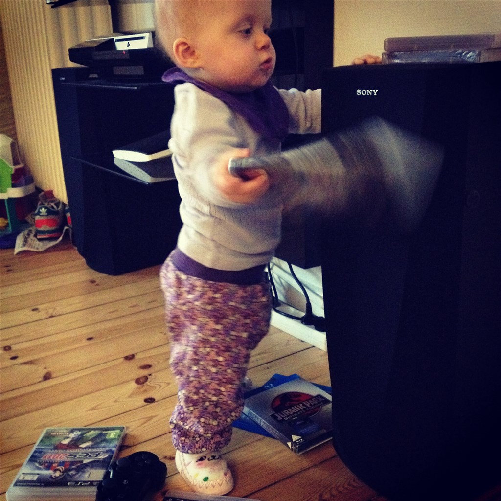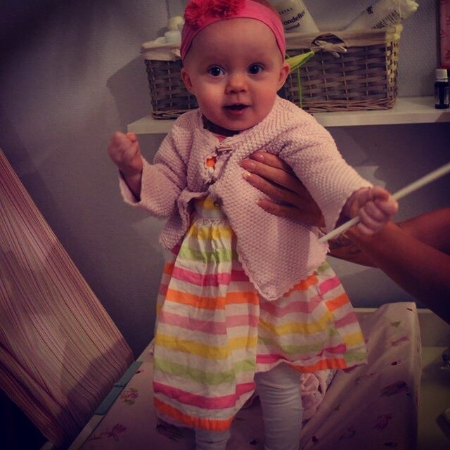 Hun peger, vinker og klapper. Hun kan sige ja, nej, tak og hej og så en masse andet volapyk. Hun kan ikke stå helt selv i mere end et par sekunder, men hun går rundt langs væggene og kan gå hvis vi holder hende i den ene hånd