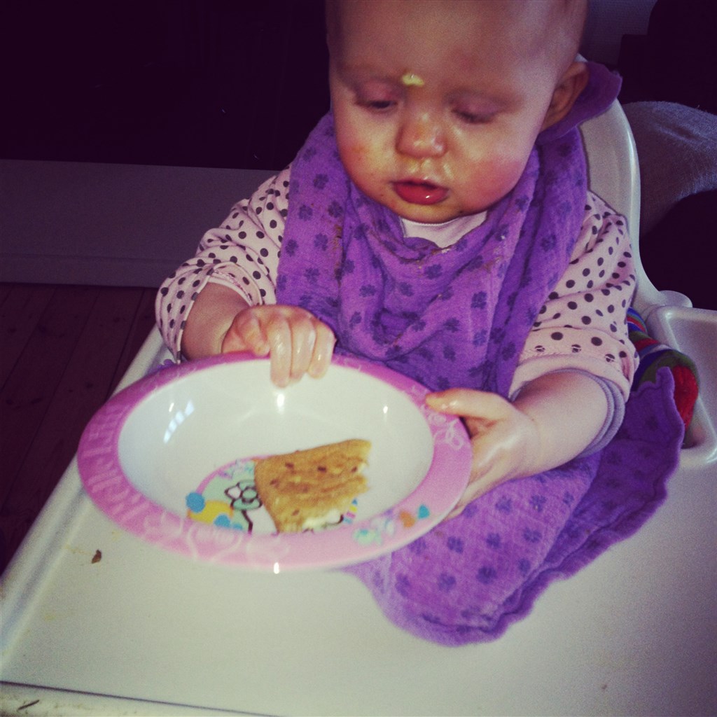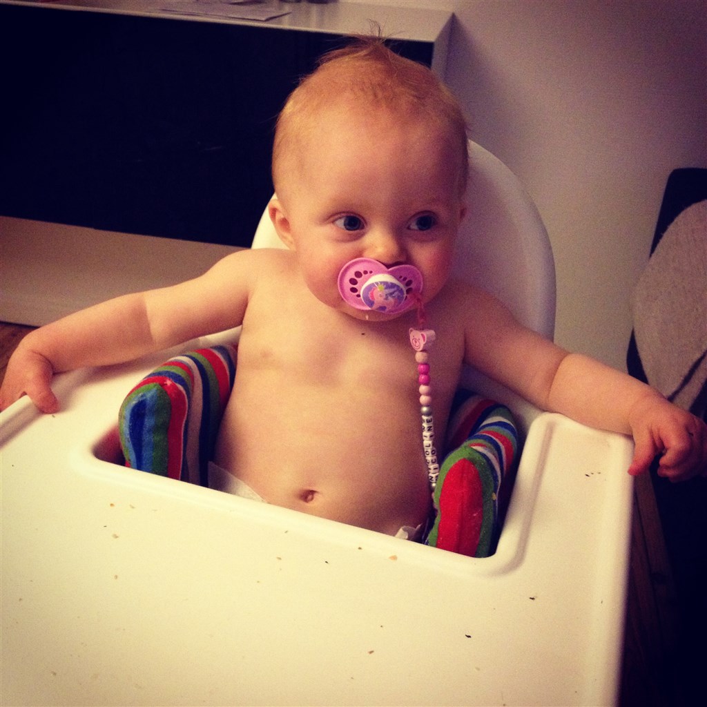Hun har 9 tænder og nogle på vej og de bliver brugt flittigt, da hun er et kæmpe madøre og helst gerne vil have en hel rugbrøds mad ind i munden