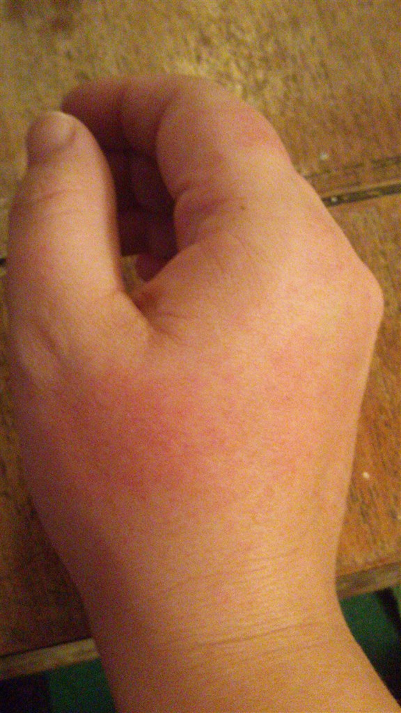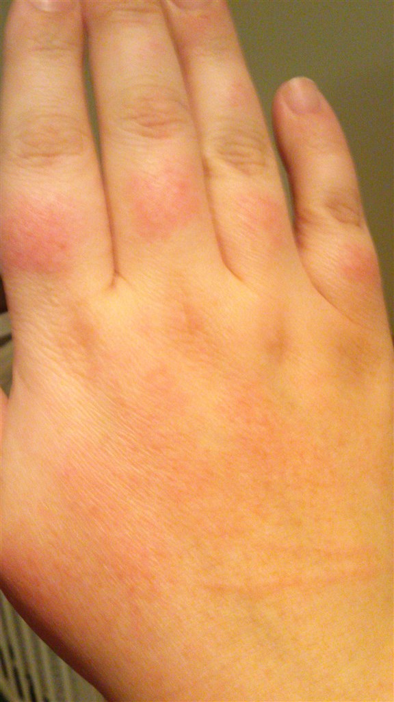 Jeg kan altså ikke liiige regne ud hvad det her er? Begyndte ligeså stille at få VIRKELIG tør og rød hud på hænderne tidligere.. Først lidt ved tommelfingeren på højre hånd og så spredte det sig ellers ret hurtigt (1 time) til over knoerne, de øverste led og det samme på den anden hånd...