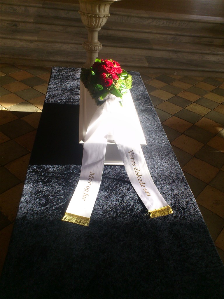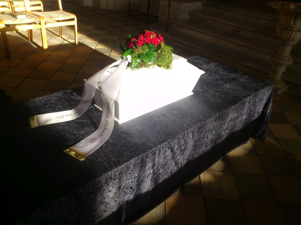 Hvor smukt solen stod ned på kisten da vi ankom til kirken. En uge og weekend hvor det havde blæst og regnet, var det lige denne lørdag, den time begravelsen tog, så smukt et vejr og han kunne ikke komme bedre afsted