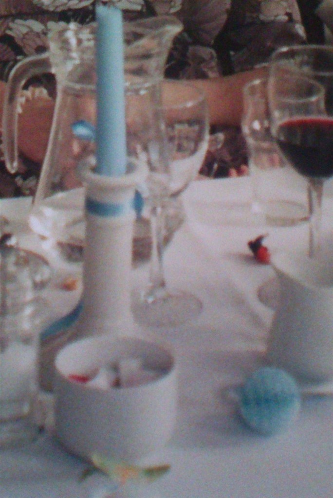Over nettet købte vi to ruller grøn dug og to ruller blåt organzastof til at løbe ned over midten. På organzastoffet kom vi de der billige vaser fra Ikea og i dem puttede vi gule og lilla blomster, også fra Ikea. Mellem vaserne puttede vi små flydelys (Ikea