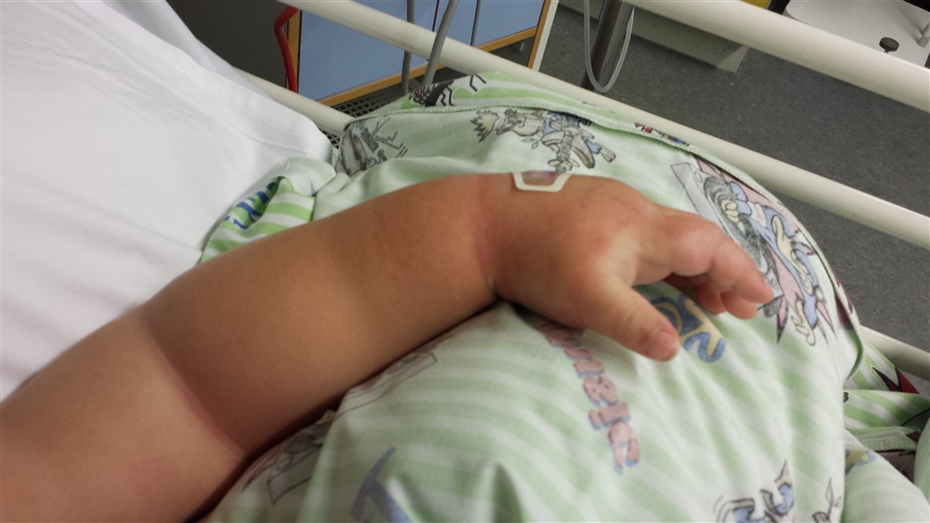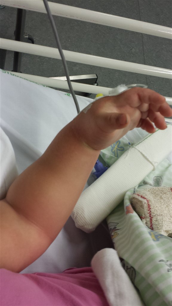 Lægerne blev ved med at give hende ventoline i , hvilket ikke havde hjulpet. Lægen kommer igen og beslutter sig for at lægge drop. Lægen får lagt et drop som han mener ligger rigtigt og en sygeplejerske binder armen ind i bandage så hun ikke risikere at rive droppet ud. Kl 04.25 kommer en sygeplejerske ind for at give noget medicin som hun forresten får hver 30 min. Hun stryger sin hånd hen og over min datters albue og siger noget er groligt galt m. Hun nærmest flår bandagen af min datter hånd samt skynder sig at fjerne droppet. Her ser jeg så min datter har en EKSTREMT STOR HÅND ! Så stor at sygeplejerske fare ned til telefonen og får fat i en akut læge, lægen kommer som et lyn og her ser han at de 150-200ml medicin min datter skulle have i drop ligger under huden. Huden er stram og hun kan ikke bøje fingerne eller håndledet. Lægen gør os klar til en akut operation de skal lette trykket fra hendes arm hurtigst muligt. Blot 35 min efter det blev opdaget lå hun på operations bordet. De har åbnet halvdelen af hendes underarm for at lette trykket mest muligt. Såret kan de ikke sy sammen da armen er så hævet at huden ikke kan nå sammen. Operationen er gået okay men hun skal opereres igen imorgen for at se om der er mulighed for at lukke det sammen.. min datter på snart 3år skal leve med et grimt ar for noget der ikke er hendes skyld. !