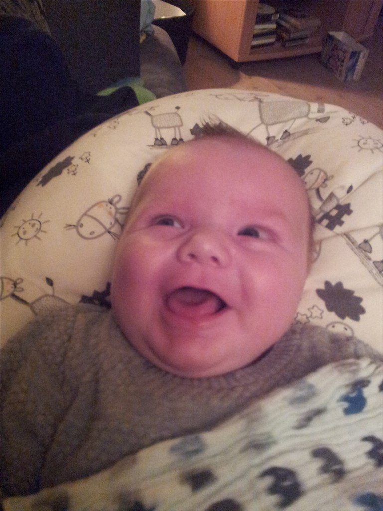 han er bare så god og mild, og en rigtig rigtig glad grinebider. Han har i lang tid været meget sparsom med smil til andre men det er han kommet godt efter og nu skal der blot et "dikke dikke" til så smiler han over hele femøren