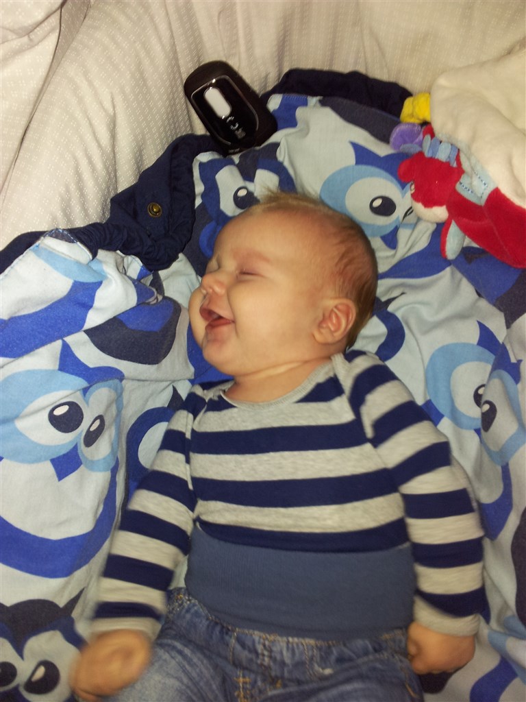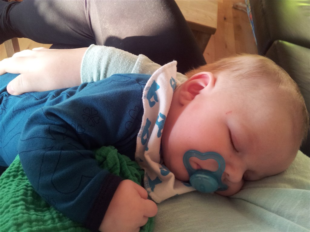 lige indtil han kommer i sit overtøj og autostolen så bliver han ulykkelig men sover inden vi når ud til bilen