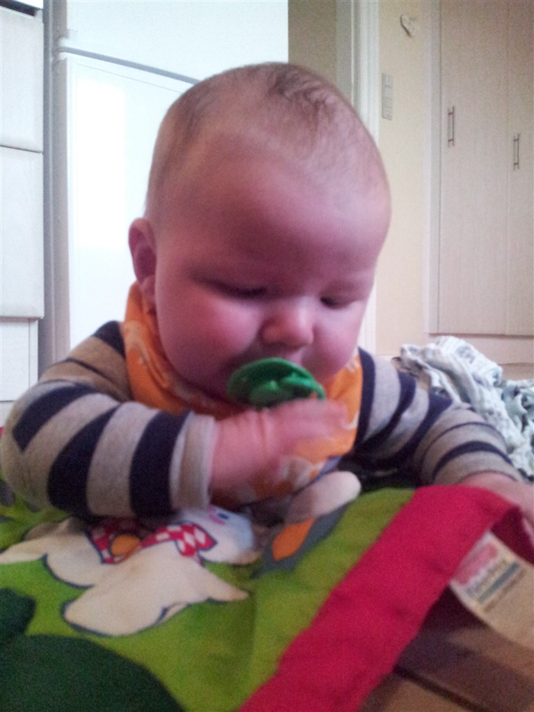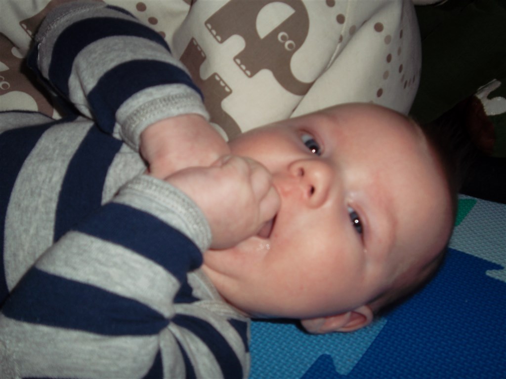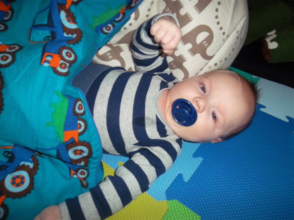 Vi bøvler stadig lidt med dagssøvn, nogle dage sover han flere timer i barnevognen, andre gange skal jeg ud til ham hvert 5-10 minut og nogen gange power napper han blot og er lysvågen efter 15 minutter. Han er begyndt at få alt med så ikke engang en køretur i barnevognen kan slå ham omkuld længere, ej heller en køretur i bilen kan gøre ham træt, først når man har kørt ca en halv time