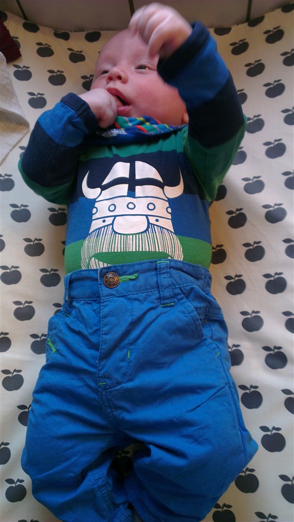 I går var han i str. 68 i tøj, det var en Hummel heldragt, som nu passer ham
