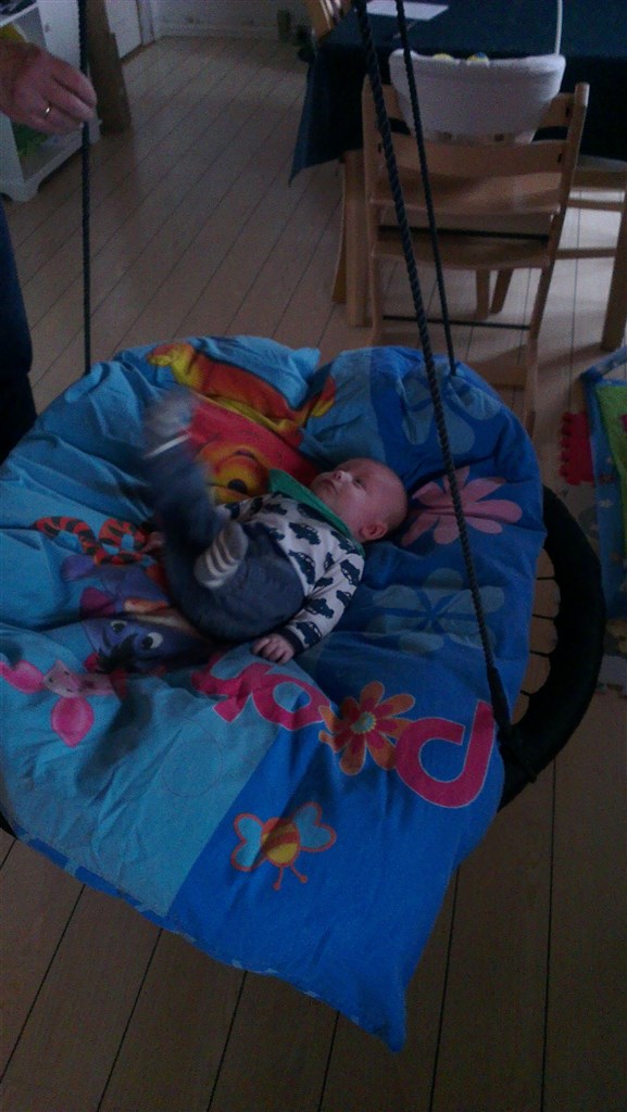 Han har fået en gynge af sin mormor og den er også bare guld værd! Han nyder at ligge og gynge!