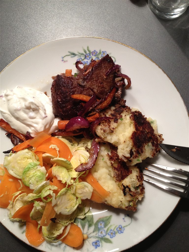 Men smagen var ok. Blandede lidt hvidløg og friske springløg i og et æg. Kødet fik lidt for længe, men smagen god. Salaten består helt simpelt af rosenkål med gulerod med citron over. Dressing; skyr med lidt mayo, hvidløg, rødløg, salt og peber.