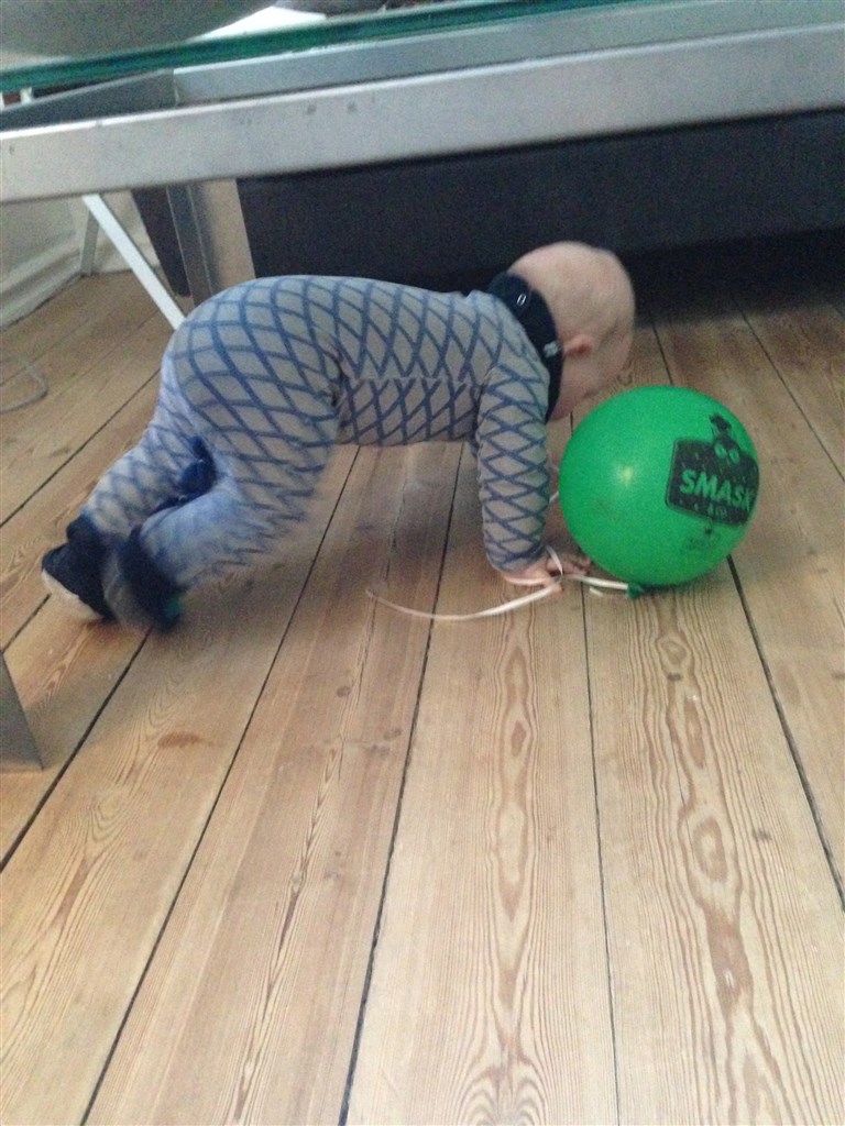 Han ruller og ruller, og øver sig på at kravle og møve og er i det hele tager bare meget aktiv. Og han har også lært at sidde