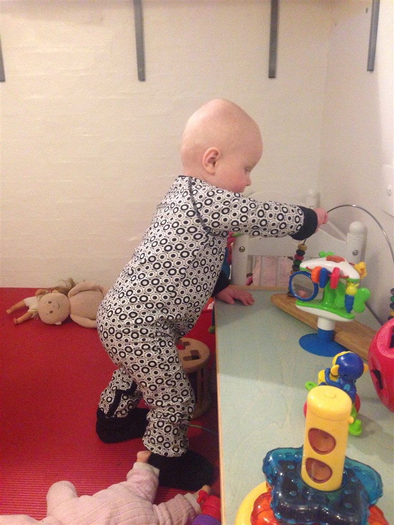 Hjalte elsker derudover at lege med sin puttekasse og bruger megen tid på at putte den runde larve i hullet. Det er dog endnu kun den runde han har fundet ud af at komme i hullet